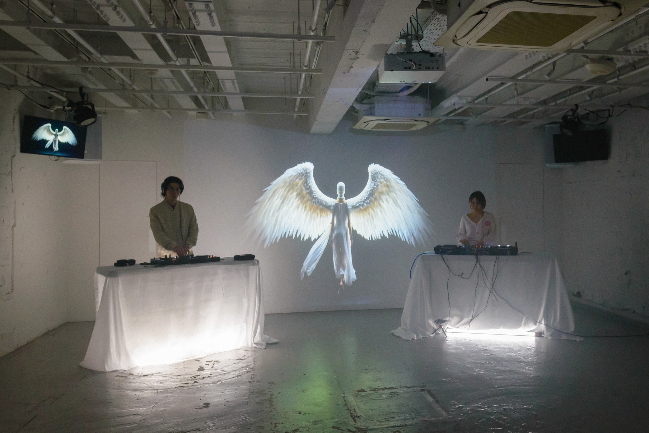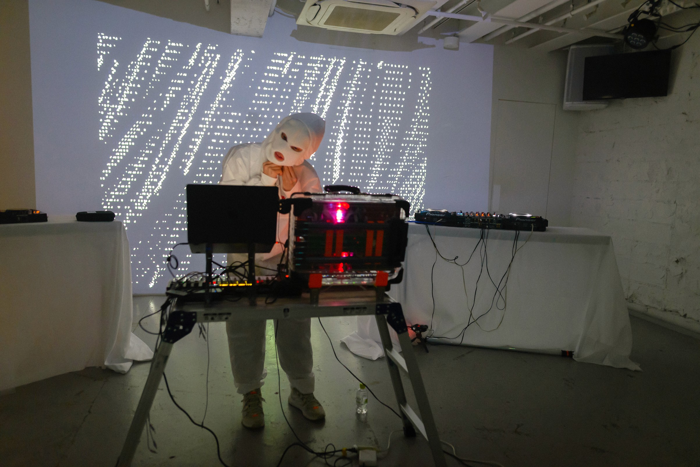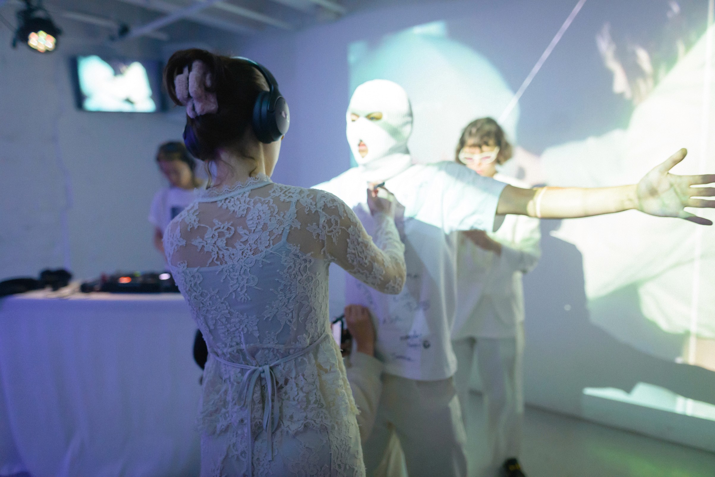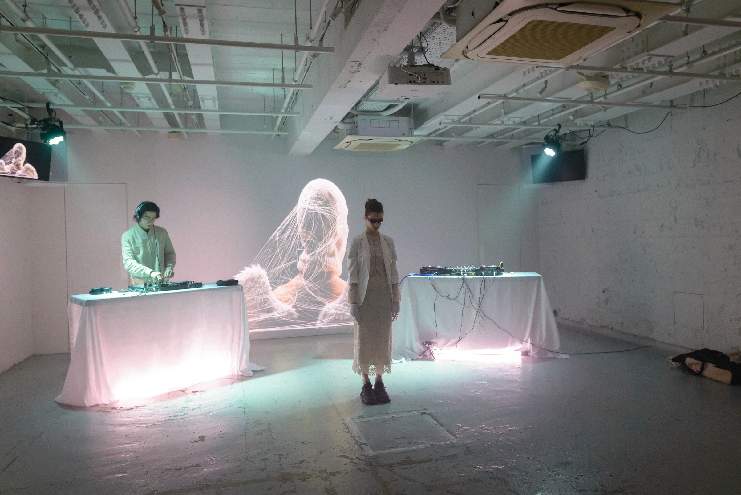 White walls. Industrial ceilings. Projection mapping covering every surface. Guests arrived in white — and became part of the installation. The space breathed with the music. The light moved with the people.